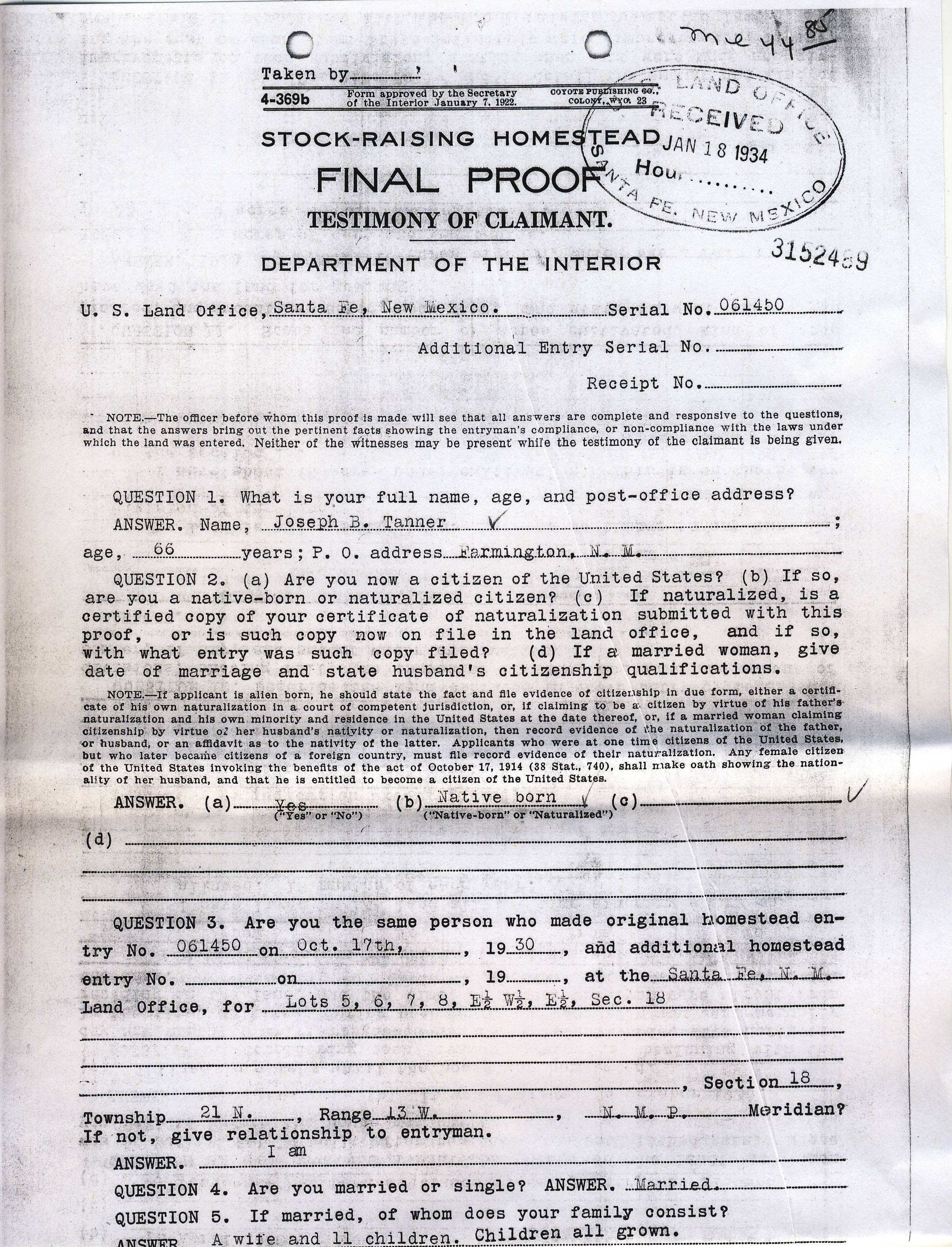 Joseph B. Tanner Stock-raising Homestead Final Proof, p. 1 February 8, 2012 ~ Dayna Jacobs - "On Granny's Trail" Original homestead entry no. 061450 on 17 Oct 1930 at Santa Fe, NM Land Office; patent no. 1070508 Share this: Click to email a link to a friend (Opens in new window) Email Click to print (Opens in new window) Print Click to share on Pinterest (Opens in new window) Pinterest Click to share on Tumblr (Opens in new window) Tumblr Click to share on X (Opens in new window) X Click to share on Facebook (Opens in new window) Facebook Like Loading... Published by Dayna Jacobs - "On Granny's Trail" I am an Accredited Genealogist® professional living in California. I have been researching and teaching since 1988. View all posts by Dayna Jacobs - "On Granny's Trail"
