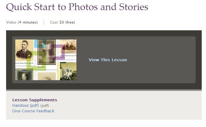 There’s a quick start tutorial for adding photos and stories, including a 20 page handout, and then a whole series of short lessons covering just about every aspect of Family Tree.