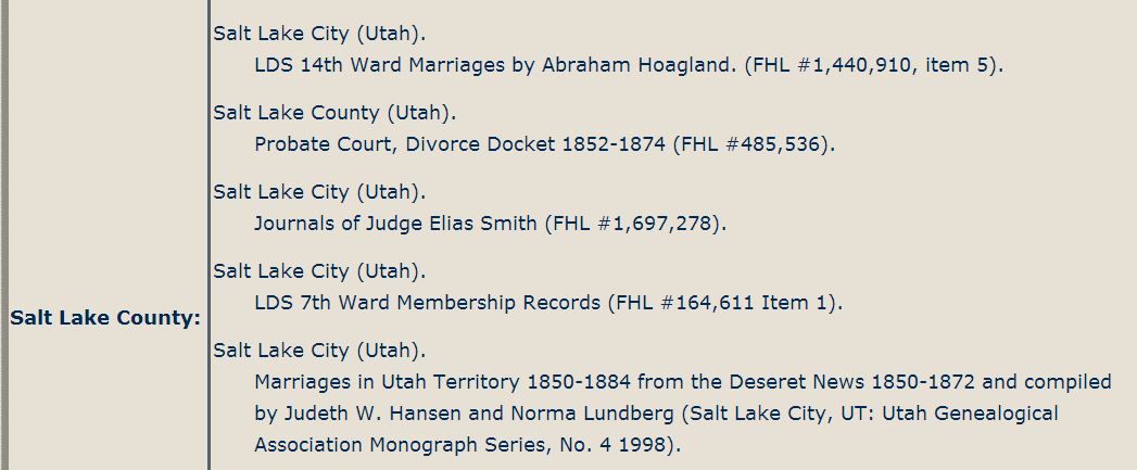 Another feature I like is the link to Utah pre-1887 sources. The indexers have identified many records which contain early marriages, such as church and court records, and have listed them for easy reference. So considerate.