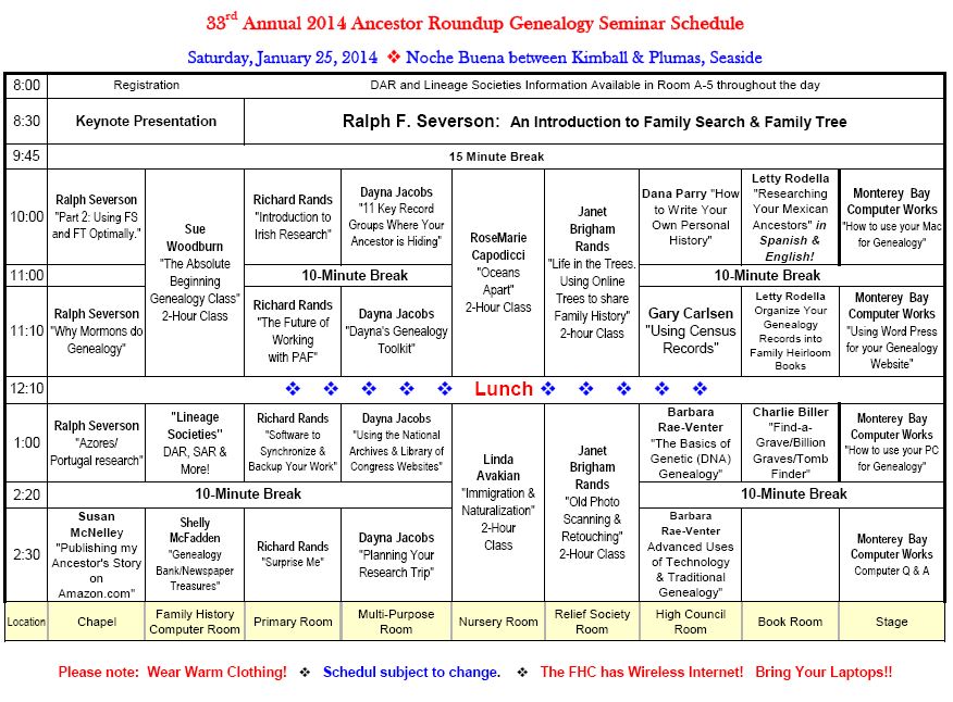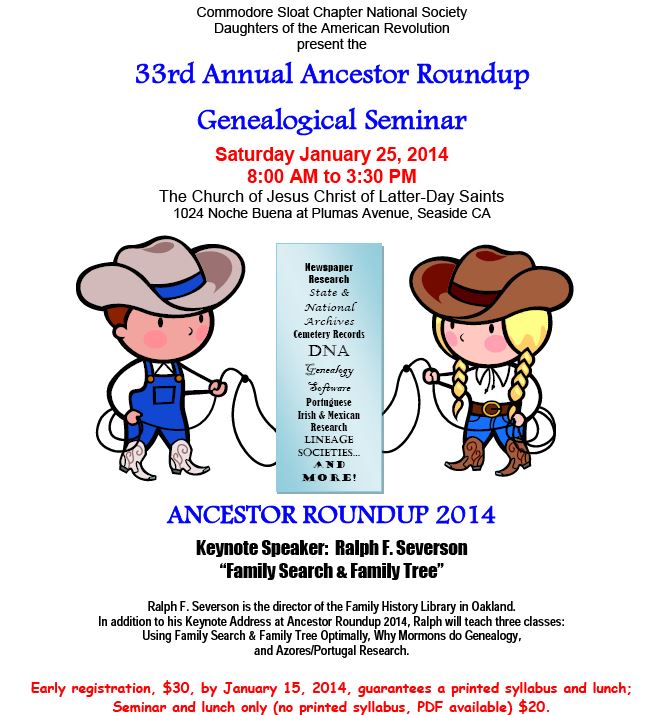 It’s time for the 33rd Annual Ancestor Roundup in Seaside (Monterey), California. I will be presenting four classes. My syllabus content is available here On Granny’s Trail under “Class Handouts.” For the full line-up check out the class schedule below.