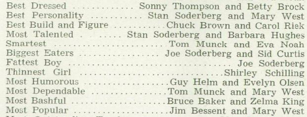 5.  Bashful:  Bashful, it turns out, narrowly avoided being nicknamed “Fatso”. Bruce, as he was named at birth, was first called Bashful in his high school yearbook in 1948,  when the annual popularity contest named  students as “Smartest”, “Best Dressed”, “Most Talented”, and “Most Bashful”, along with “Fattest Boy”, “Biggest Eaters” and “Skinniest Girl”. I kid you not.  So while Bruce may have wished to be remembered as “Most Likely to Succeed”, he became famous for being Bashful, so in a way his wish came true. Dwarves - Bashful Orofino HS 1948