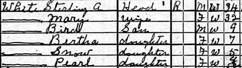 Snow White:  And finally, I should catch you up on Snow White. I was delighted to discover Snow White on a census record with her parents Stirling and Mary,  and siblings Bird, Bertha, and Pearl.  Apparently the kingdom was in Union County, Georgia, and there were more in her family than we were led to believe. And props to her parents for sister Pearl’s name. Bird is actually not bad, either.