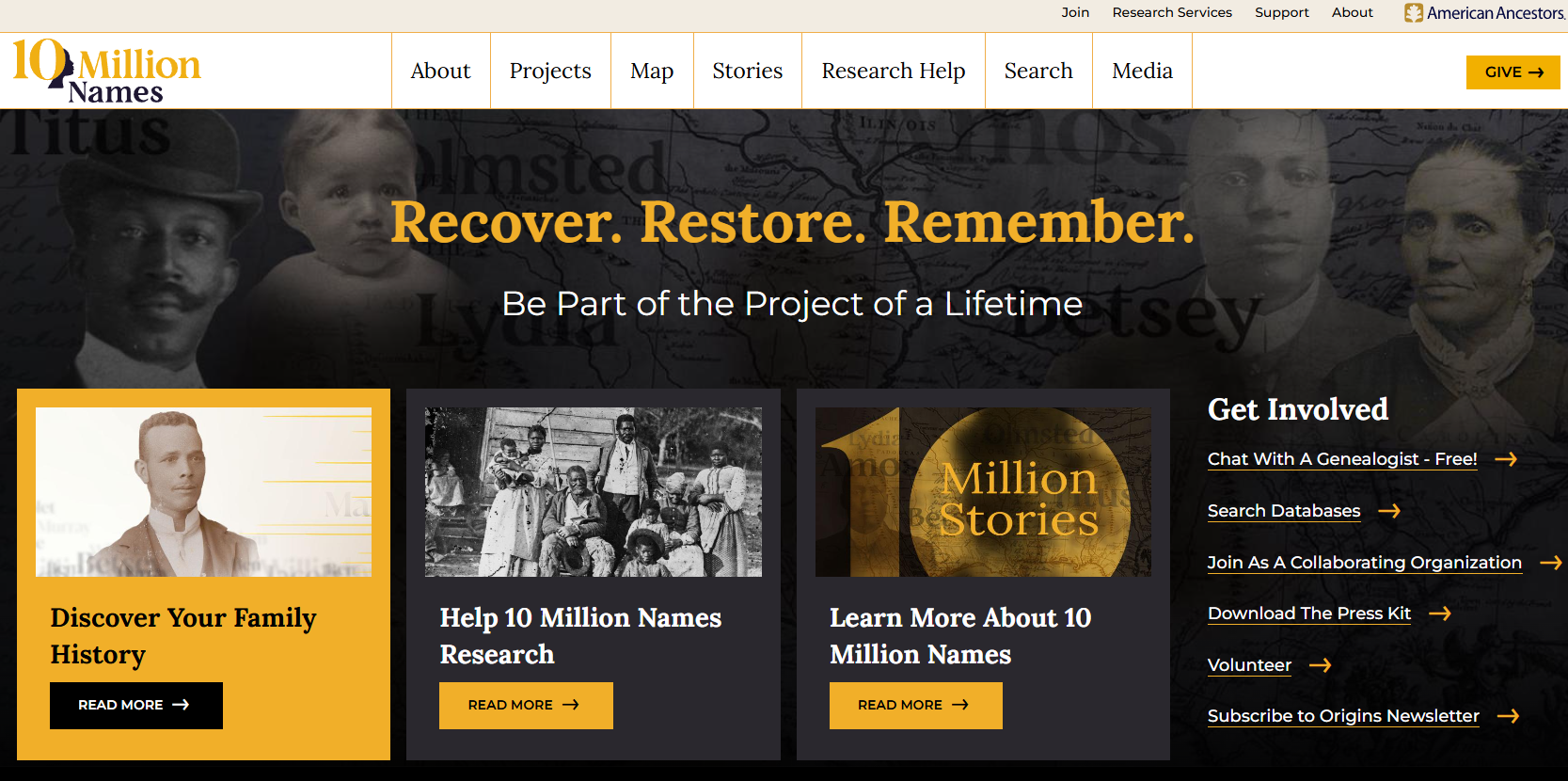 The 10 Million Names project emerged as one of the top websites for African American genealogy in 2024, according to Family Tree Magazine. In addition to resources such as a free online course titled, “Getting Started in African American Family History Research,” there are research guides, free charts and templates, events and videos, links to cultural sites, and resources compiled by FamilySearch. Of note are the searchable databases accessible on the 10 Million Names website hosted by American Ancestors website.
