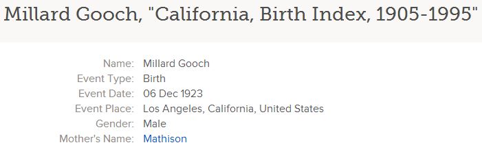 California Birth Index, 1905-1995, on Familysearch.org, Millard Gooch entry