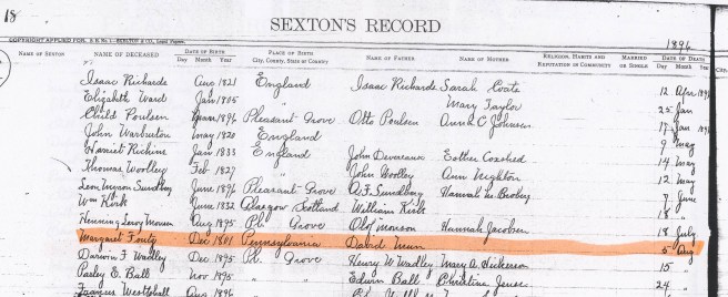 Margaret Mann burial record, Pleasant Grove City Cemetery Sexton’s Record, 1886-1981