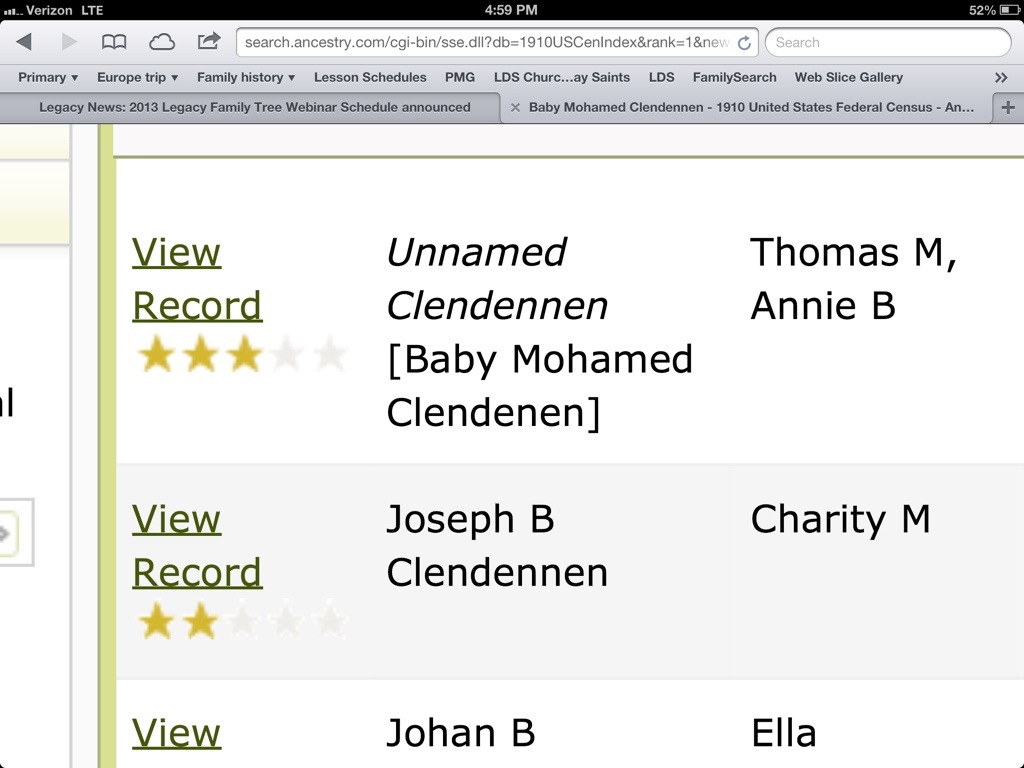 Today, I share a humorous reminder of why we always check the original source whenever possible, and always look at indexes and abstracts with a healthy dose of “hmmmm…what does it really say?” Last week, whilst searching for Thomas Clendennen [Clendenen] in the 1910 U.S. Census index, I was surprised to find a newborn, little “Baby Mohamed,” enumerated with the family.