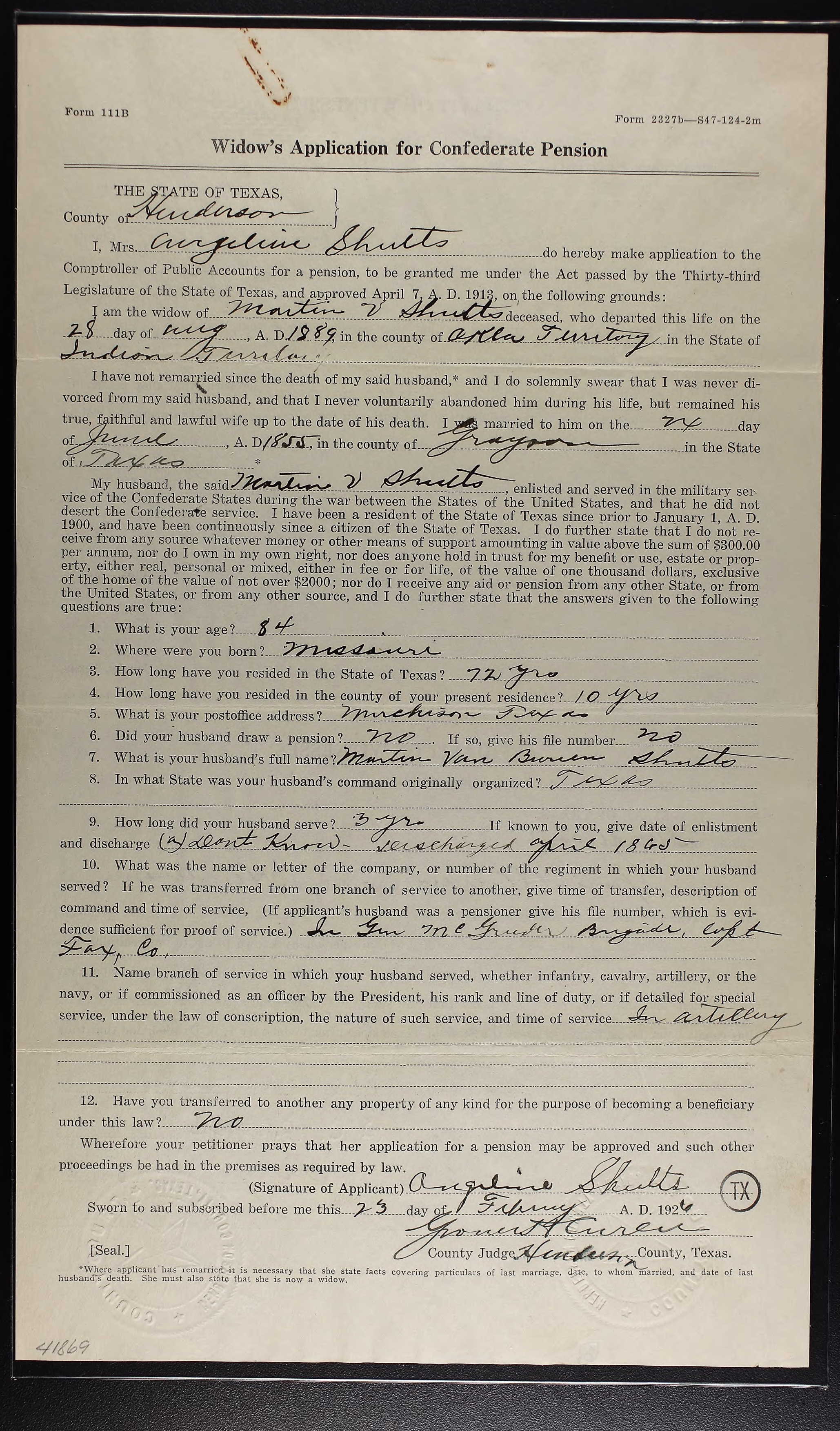 Here is an image of Angeline Shults’ Confederate Widow Pension Application, from 23 Feb 1923. She is my great-great grandmother. She claimed her husband, Martin Van Buren Shults served in the Confederate Army for three years before being discharged in 1865. I just discovered this record on Ancestry.com, and there are many more pages in the file. This page gives important information about Martin’s death date and place, their marriage date and place and their ages, places where Angeline lived, as well as Martin’s middle name. Prior to this I did not know Martin was in the Civil War, nor did I have any documents with his middle name. It is an interesting record: