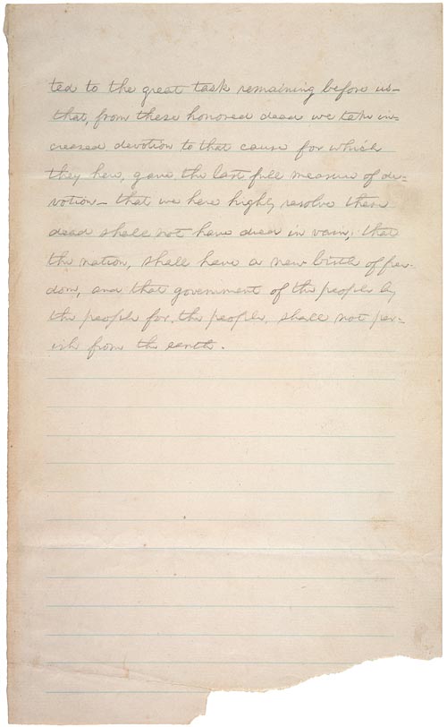 It is rather for us, the living, to stand here, we here be dedica-ted to the great task remaining before us — that, from these honored dead we take increased devotion to that cause for which they here, gave the last full measure of devotion — that we here highly resolve these dead shall not have died in vain; that the nation, shall have a new birth of freedom, and that government of the people by the people for the people, shall not perish from the earth.