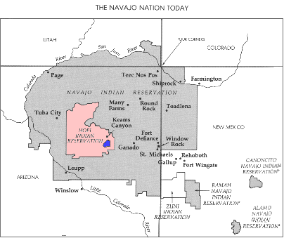 Map of the Navajo Nation today. Notice where Tuba City, Arizona is, and where Farmington, New Mexico is. The Tanner and Foutz families were in Tuba City from about 1877 to 1903, when they moved to the Farmington area (to the town of Kirtland). When they settled in Tuba City it was not part of the Navajo Reservation, but relocated in 1902/1903 when the reservation was expanded and the townsite was designated for an Indian school.