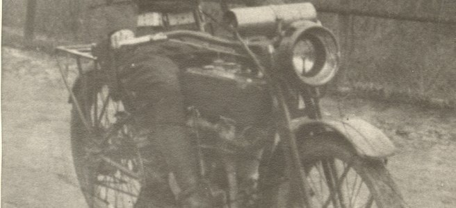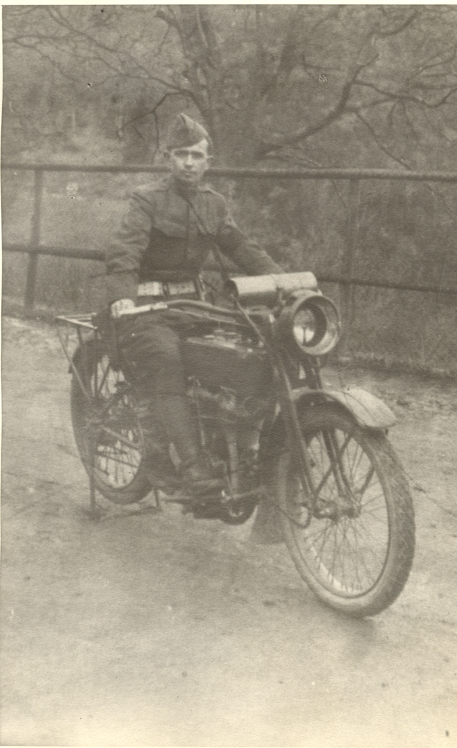 Pvt. A.L. Gooch on his motorcycle, WWI 89th Div., Military Police