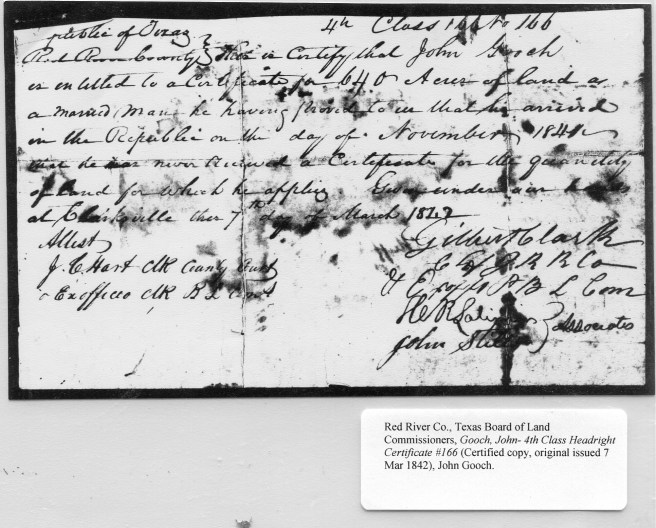 Red River Co., Texas Board of Land Commissioners, Gooch, John- 4th Class Headright Certificate #166 (Certified copy, original issued 7 Mar 1842), John Gooch.