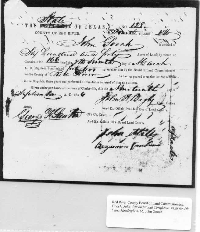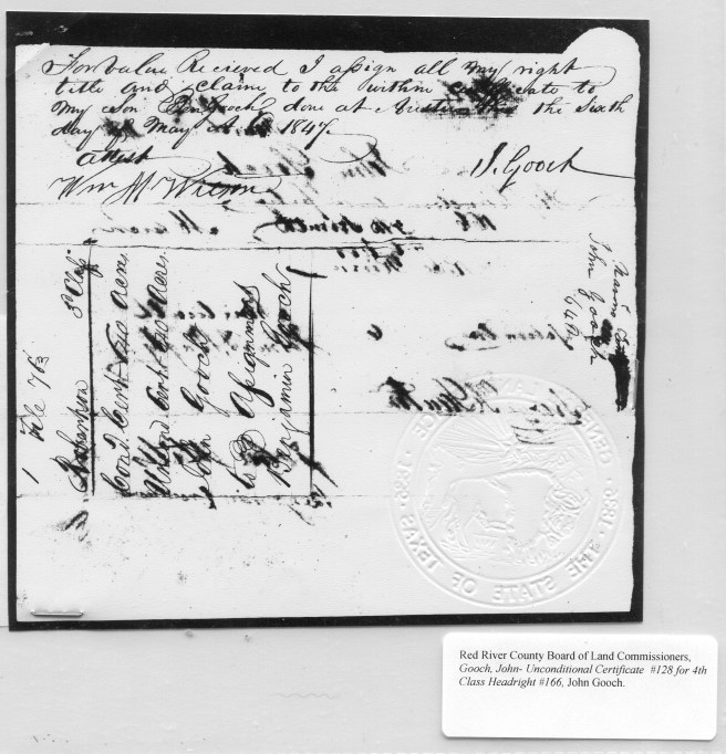 Here are a few documents from John Gooch’s  file, obtained from the Texas General Land Office. Note the first one is from the Republic of Texas, 7 Mar 1842, in Red River County:
