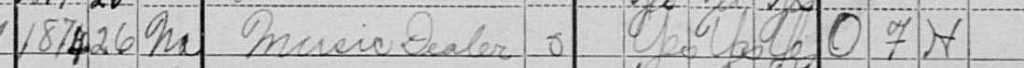 These are all things worth following up on, and I accessed a number of sources you may not know exist. Of course the easiest thing to try first is a Google search, and this got me started on the thing I was most curious about initially – no, not the immigration/citizenship columns – but “Music Dealer.” That is something you don’t often see on a census record.
