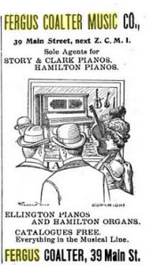 Other online city directories revealed Fergus Coalter had also been in business as Coalter and Snelgrove, Daynes and Coalter, and Fergus Coalter Music Co. His death record showed him working as a clerk at Beesley Music Co. at age 71. I can do a more thorough search of directories at the Utah Research Center and Family History Library when I am there.