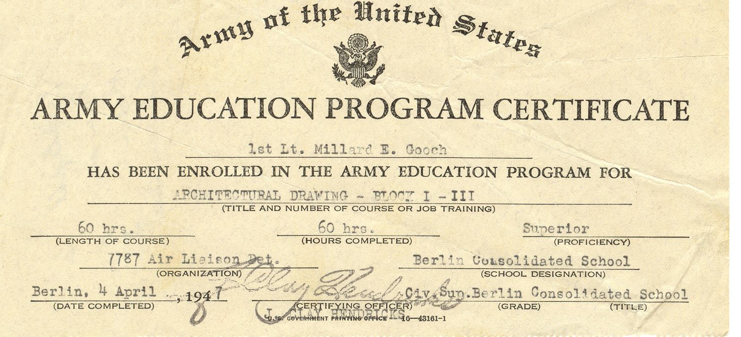 While in Berlin, he also was enrolled in the Army Education Program at the Berlin Consolidated School.  Here is his certificate of completion for a drafting course.  Notice the “superior” grade.  Good job, Dad!