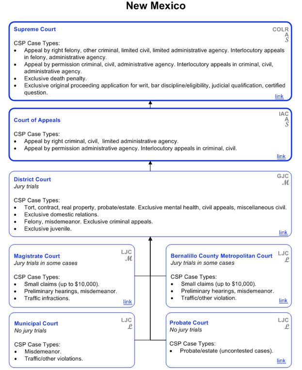 New Mexico State Court Structure State Court Structure for New Mexico from Courtstatistics.org https://cspbr.azurewebsites.net/ Share this: Click to email a link to a friend (Opens in new window) Email Click to print (Opens in new window) Print Click to share on Pinterest (Opens in new window) Pinterest Click to share on Tumblr (Opens in new window) Tumblr Click to share on X (Opens in new window) X Click to share on Facebook (Opens in new window) Facebook Like Loading...