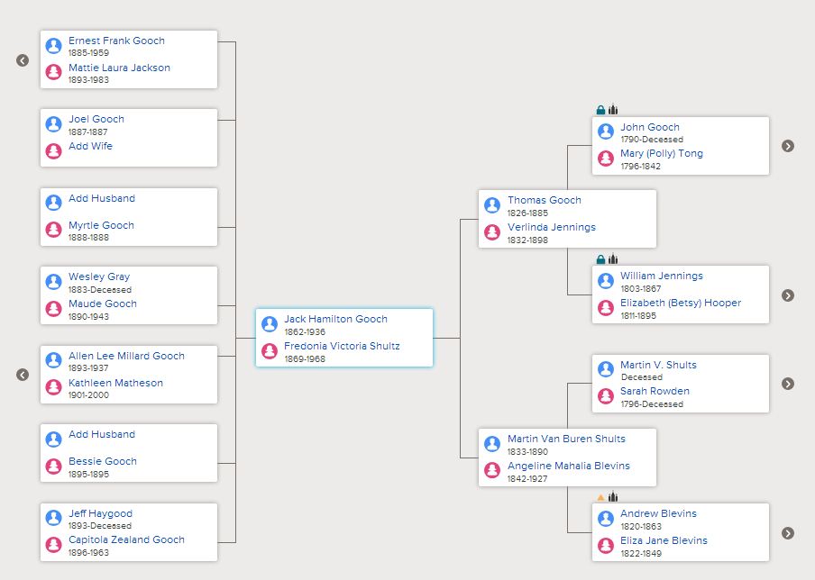 I love it! The photos make my tree come alive and is easy to navigate. Click on the “up” arrows to see more generations. Click on the “down” arrows to see descendants.