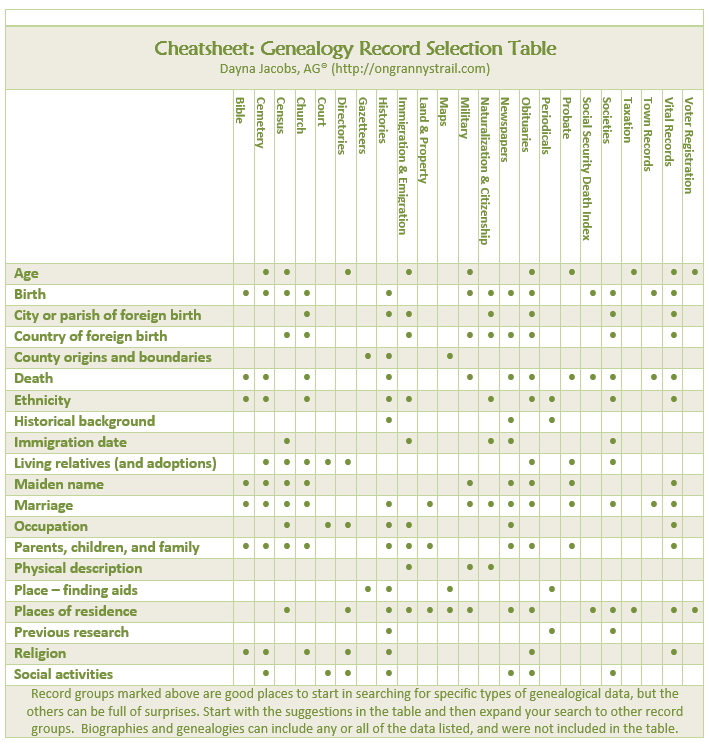 Cheatsheet: Genealogy Record Selection Table Cheatsheet: Genealogy Record Selection Table by Dayna Jacobs, AG Share this: Click to email a link to a friend (Opens in new window) Email Click to print (Opens in new window) Print Click to share on Pinterest (Opens in new window) Pinterest Click to share on Tumblr (Opens in new window) Tumblr Click to share on X (Opens in new window) X Click to share on Facebook (Opens in new window) Facebook Like Loading...
